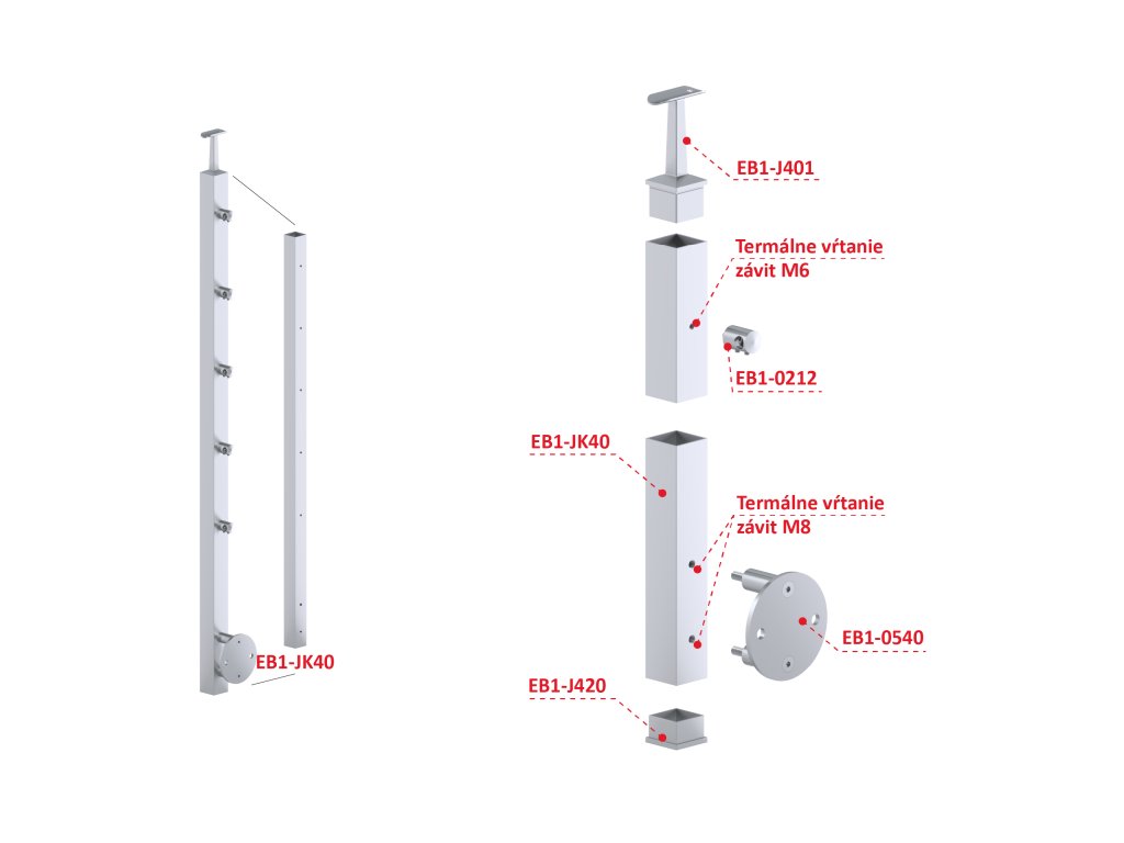 nerezový stĺp, bočné kotvenie, 5 radový priechodný, vnútorný, vrch pevný(40x40mm), brúsená nerez K320 /AISI304Dodatočné parametre