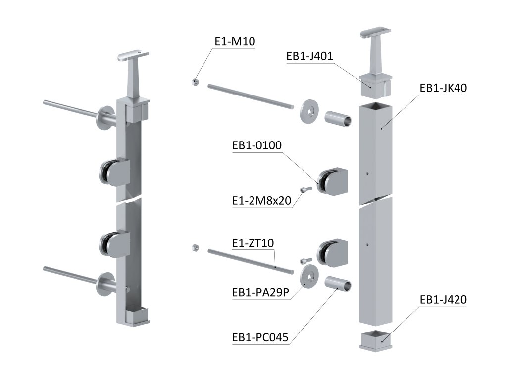 nerezový stĺp, bočné kotvenie, výplň: sklo, ľavý, vrch pevný, (40x40x2.0mm), brúsená nerez K320 /AISI304Dodatočné parametre