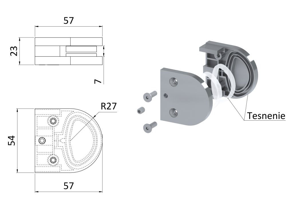 ZAMAK brúsena svorka skla plochá (56x53x24mm), pre sklo 8-10mm, balenie obsahuje gumičky, materiál: zliatina AL/ZN