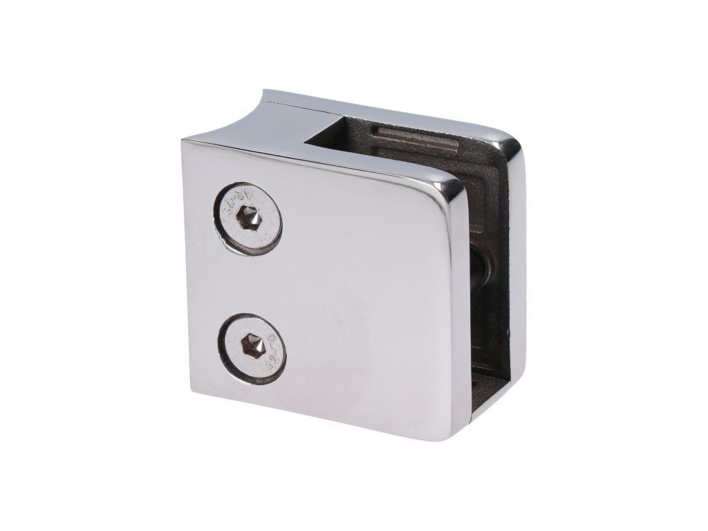 Svorka skla /plechu na trubku ø 42.4mm (45x45x27mm) pre sklo 6-12.76mm, so spodnou podložkou, leštená nerez AISI304, balenie neobsahuje gumičky na sklo