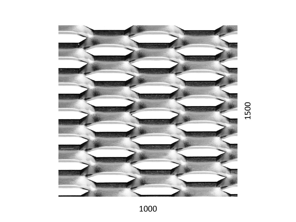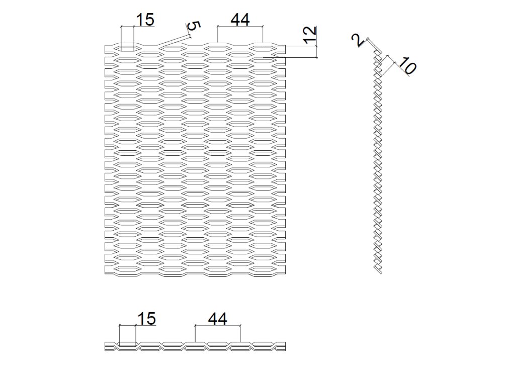 ťahokov Zn, kosoštvorcové oko: 44x12mm, mostík: 5mm (1000x1500x1.5mm), orientácia oka: rozmer oka 44mm je rovnobežná s rozmerom tabule 1000mm
