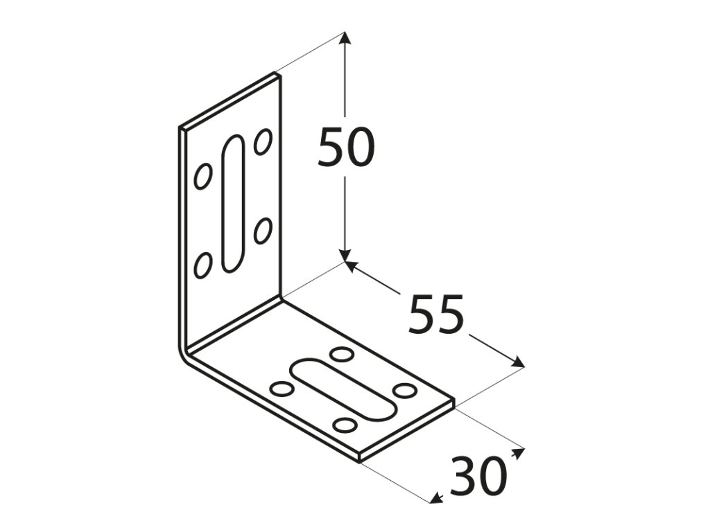 uholník nastaviteľný 50x55x30mm, 2,0mm, pozink, diery 5mm-8ks, otvory 6,5/23mm-1ks, 8,5/21,5mm-1ks