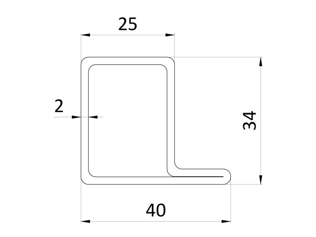 uzavretý profil L 40x34x25x2mm, čierny S235, L=6000mm, cena za 1ks(6m), čierny bez povrchovej úpravy, predaj len v 3 a 6m dĺžkach