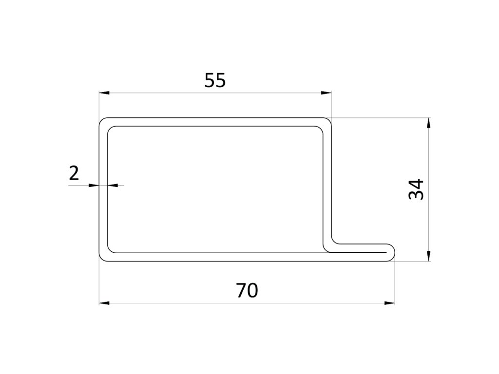 uzavretý profil L 70x34x55x2mm, čierny S235, hladký L=6000mm, cena za 1ks(6m), čierny bez povrchovej úpravy, predaj len v 3 a 6m dĺžkach