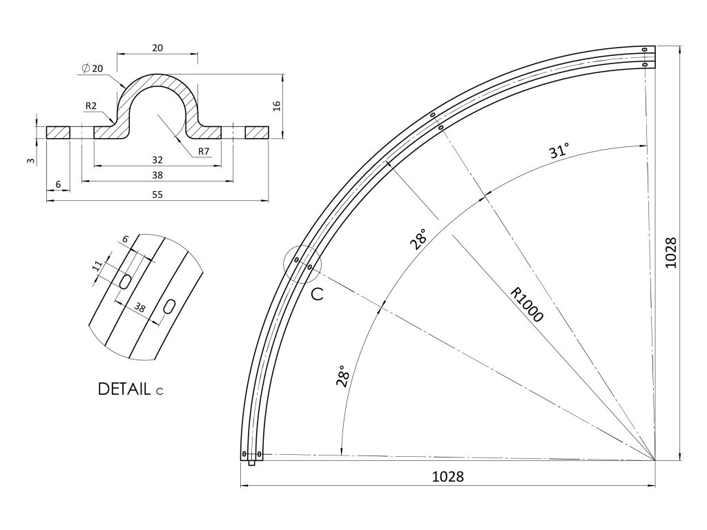 Vodiaci profil pre brány, U profil, dĺžka 1m, zakrivenie 90 stupňov