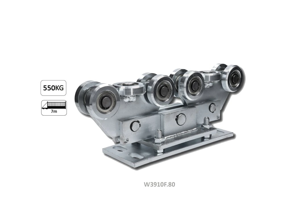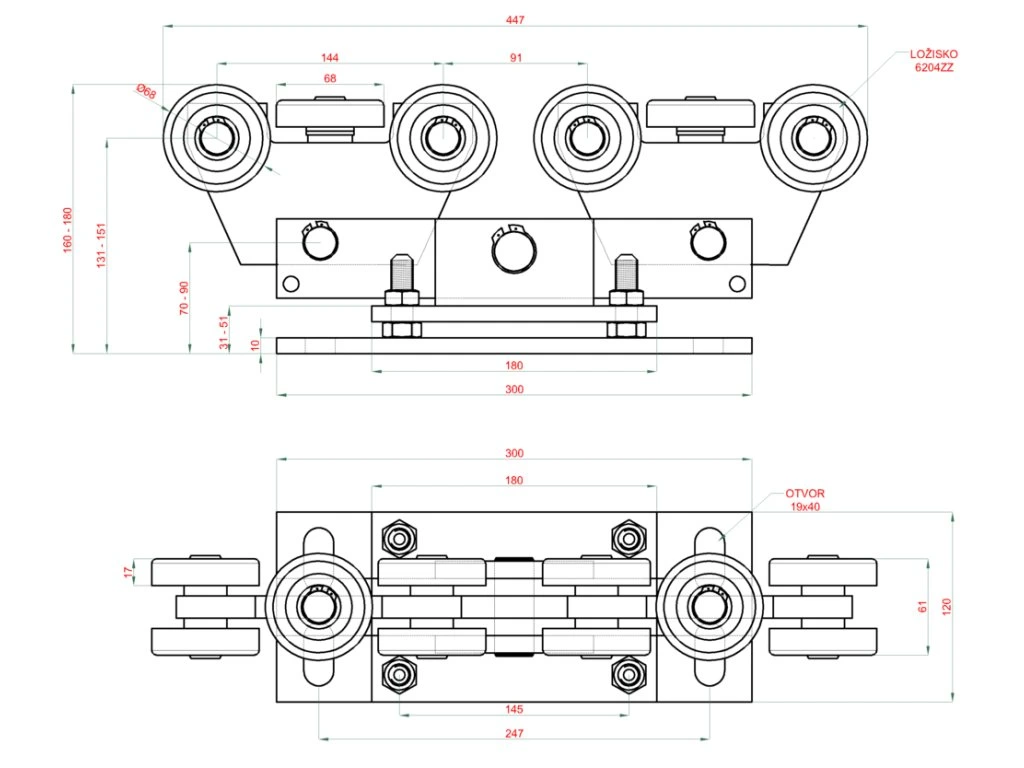 Vozík pre C-profil 80x80x5mm výškovo nastaviteľný, 10x oceľové koliesko s ložiskom 6204ZZ, galvanické zinkovanie