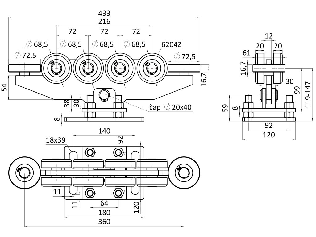 Vozík pre samonosný systém do 500kg, 10 kolieskový, výškovo nastaviteľný, pre profil 80x85mm