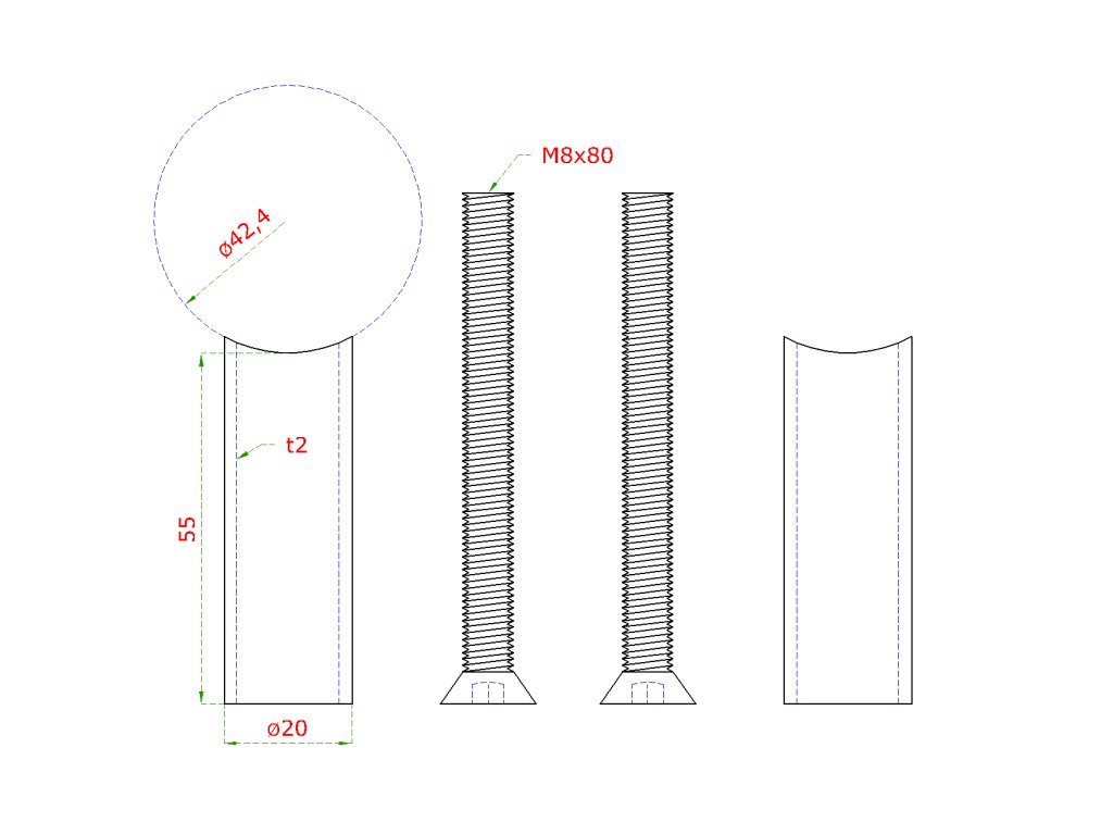 prechod na vymedzenie vzdialenosti medzi stĺpom ø 42.4mm a kotviacou platňou, ø 20x2.0mm /L:55mm, vnút. skrutka: M8x80mm, brúsená nerez K320 /AISI304, bal: 2ksDodatočné parametre