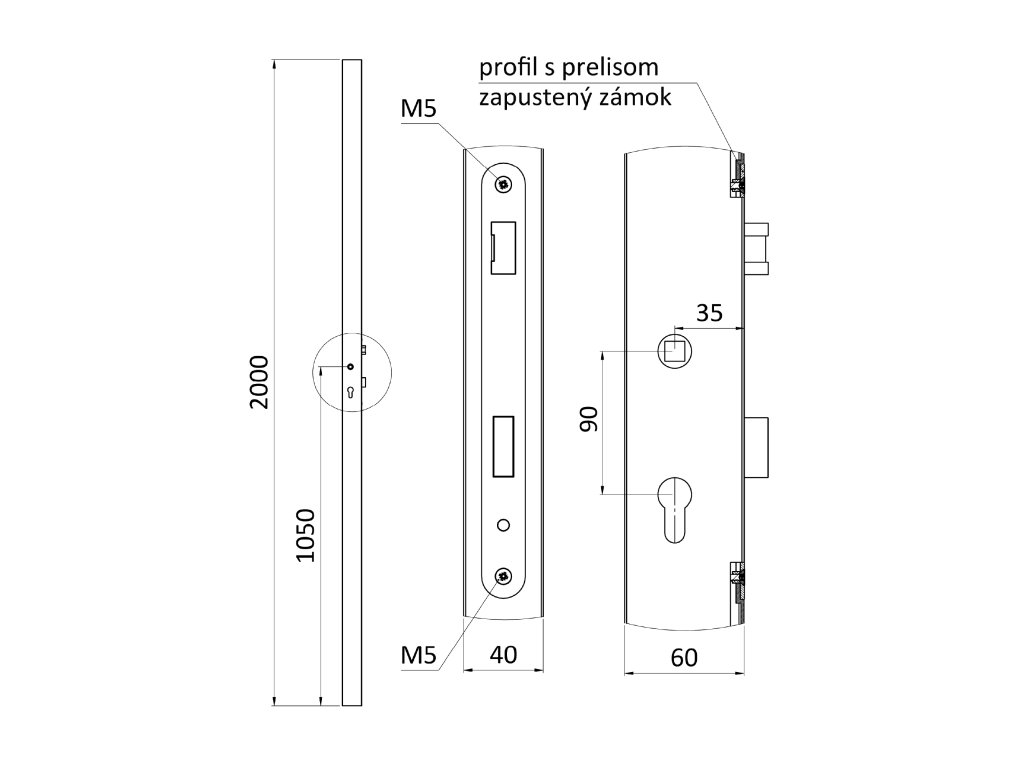 Profil 60x40x1,5mm H-2000mm so zapusteným zámkom, vhodný pre rám bránky, bez povrchovej úpravy