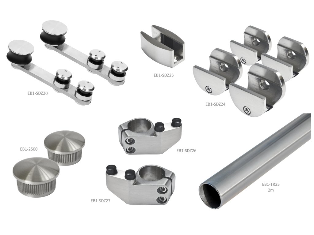 závesný systém - set na sklenené dvere (hrúbka skla: 8.00 - 12.00mm), set obsahuje: EB1-SDZ26 1ks, EB1-SDZ27 1ks, EB1-SDZ20 2ks, EB1-SDZ24 4ks, EB1-SDZ25 1ks, EB1-2500 2ks, EB1-TR25 2m brúsená nerez K320 /AISI304