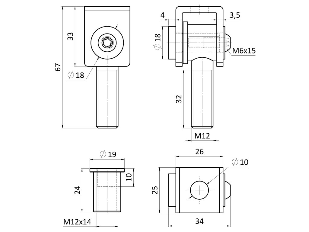 Navárací záves M12 s nitovacou maticou, otvárateľný 90°, nastaviteľný 1D, brúsená nerez / AISI 304