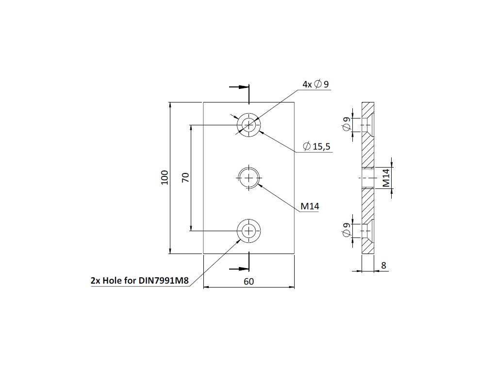 Kotviaca platňa pre EB1-ZPK01, rozmery 100x60x8mm s 2 x 15,5mm otvormi a 1xM14 závitom, brúsená nerez AISI304Dodatočné parametre