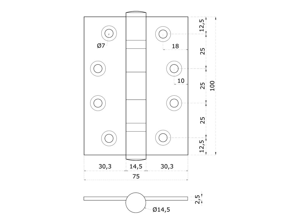 nerezové pánty 2ks, 100x75x2.5mm, max. nosnosť: 70 kg, brúsená nerez K320 /AISI304Dodatočné parametre